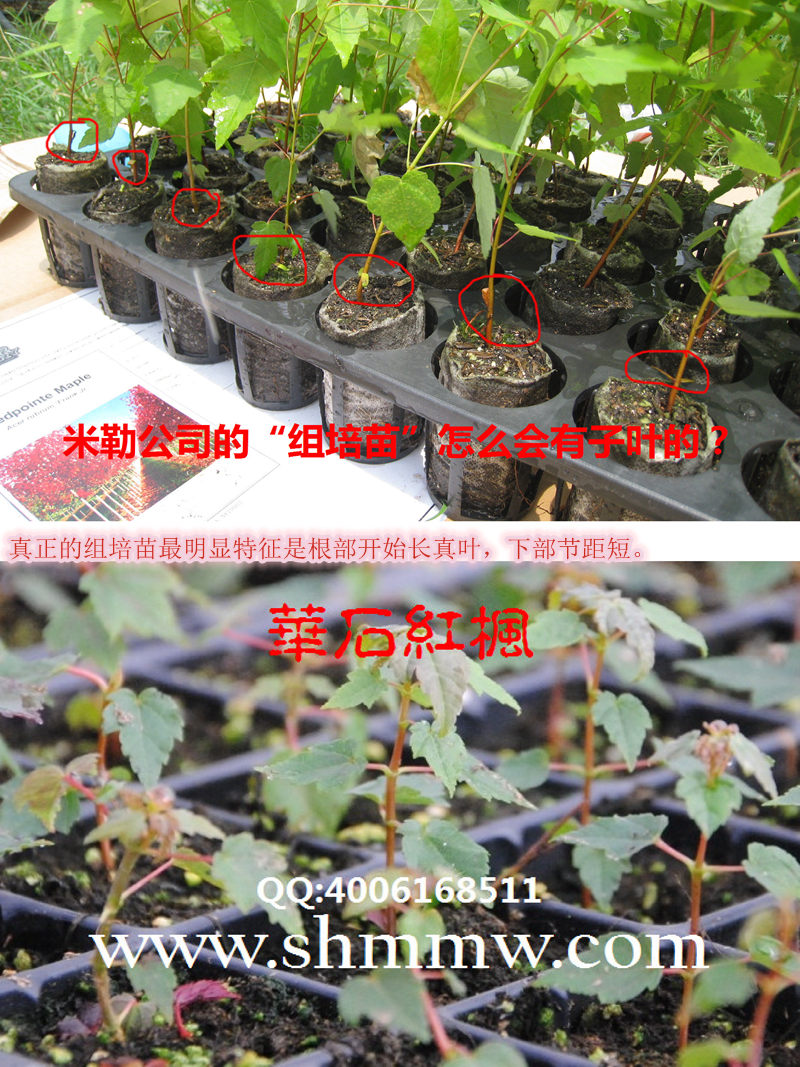 • 2012年本公司员工从米勒基因组培工厂(青岛风和日丽)购买一批红点红枫组培苗(如图)详细过程记录,后经鉴定为籽播苗。借助此案例教大家一个简单鉴别组培苗与籽播苗的方法: